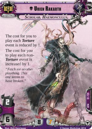 Urien, in his natural state, is an event warlord, pure and simple. You gotta play by his rules or he will make your life miserable and that means Torture events and ONLY Torture events. But that’s not such a bad thing. There are many Torture events that are quite good, particularly if you’re lucky enough to get Urien’s signature attachment, the Ichor Gauntlet, which can be devastating if your opponent is investing in expensive units. That being said, we all know events can only go so far and that’s where our old friends Baleful Mandrake and Altansar Rangers come in. It’s hard argue against the fact that Ranged is one of the more powerful keywords in Conquest right now. Being able to destroy your opponent’s units before they can even take a swing at you is a beautiful thing. The issue being that there are few units besides those two that are worth their cost. With only six Ranged units you’re most likely only going to take out one to two units before your opponent comes in and smashes your frail space elves to pieces. And since Torture events are so valuable it’s never fun to use them as shields when you could be causing your opponent misery. Enter Hypex Injector. At 0 cost it’s return on investment is amazing considering just how many cheap Torture events you have at your disposal. Throw this baby on one of your Ranged units and you can ready it every time you use one of your T__orture events - Urien’s signature event, at 0 resources, is always a fine choice - and enjoy pinging your enemies with Ranged attacks for days. Besides that, it’s a simple game of making sure you have plenty Torture events to play, and that means winning command. While resources are great, it’s cards that really matter with Urien. More cards equals more cheap events you have to play equals fewer options your opponent has. Urien has to be played surgically, so it’s not about winning every battle. Just the ones that matter. So don’t try to win every planet; you most likely will not have enough Ranged units to spread around. While Warlock Destructor can hold it’s own in a fight, if you try to win planets you don’t need, you might regret that investment later. So focus your combat units on the planets that mean victory for yourself (or your opponent) and spread out your command units to win you those precious cards you need while Urien command snipes. He isn’t that great in a fight and he rarely has to be at a planet for his events to have an effect on the game. Once he is bloodied the deck becomes an uphill battle.