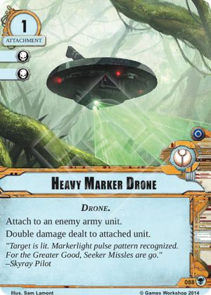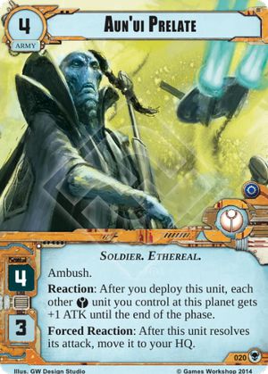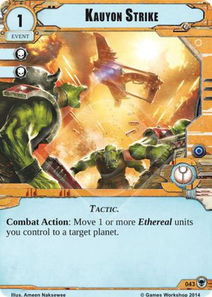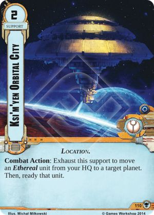 Closing out the War Pack as always are the Tau. First they get the Fire Warrior Grenadiers. This unit is ok for its cost but it lack of printed command hurts. If the Ethereal units available continue to expand, especially 2 or 3 cost options, this unit may become more popular, but until that time they will likely rarely see use. Finally the very last card in the War Pack is maybe the most talked about. Ksi’m’yen Orbital City is a super powerful card that really completes the Aun’shi deck. The Orbital City takes all the downsides of the Ethereal trait units and turns it into a great advantage.