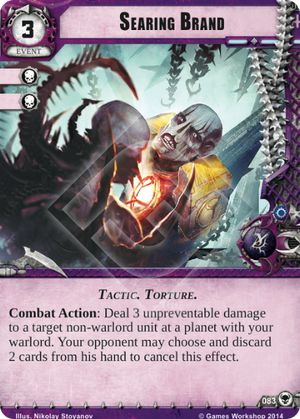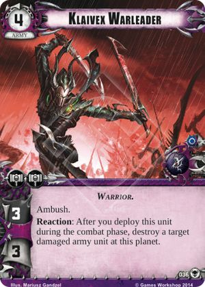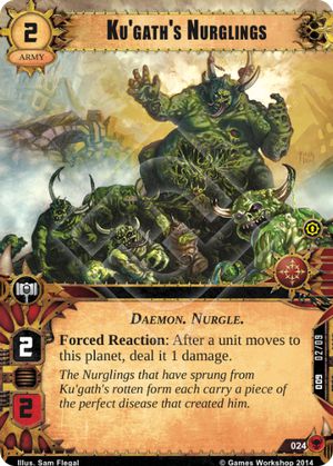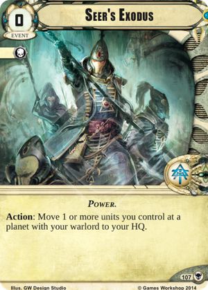 For Eldar utility is the name of the game in The Threat Beyond. Mighty Wraithknight is a very powerful combat unit with an interesting ability. The exhaustion does hit your own units but if played correctly it can be easy to work around. Maybe you opponent has a lot of Ranged or the majority of your combat forces are in HQ, this effect will help balance that battle. Next Seer’s Exodus, an unassuming card, brings a new powerful trick to the table. I think a couple copies of this card is a great choice to include in any decks using Eldar cards. Seer’s Exodus provids a way to get out of bad situations you wouldn’t otherwise be able to. An excellent counter to Aun’shi and other assassination warlords, it leats you play riskier than you normally would be able to. Finally the children of Isha get Slumbering Gardens. Right now this card has next to no use. Maybe in the future we will see a reason to play it.