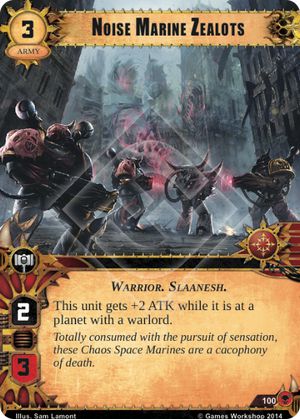 Chaos get the veggies of this War Pack. The cards included aren’t flashy or exciting but generally they are good to have available. The Noise Marine Zealots perhaps exemplify this the most. The Zealots help fill in the 3 cost slot in the faction’s curve, something Chaos needed more than many people realized. And in Zarathur they are a prime target for Infernal Gateway, raising a threat that players need to be constantly conscious of. The other cards given to Chaos have a lot of potential for growth. Turbulent Rift has a great ability but suffers from the need to use Elites. As support for the trait expands though the value of this card will increase. Cacophonic Choir on the other hand has good utility in the swarm heavy meta but doesn’t quite seem to fit in any of the warlords released to date.